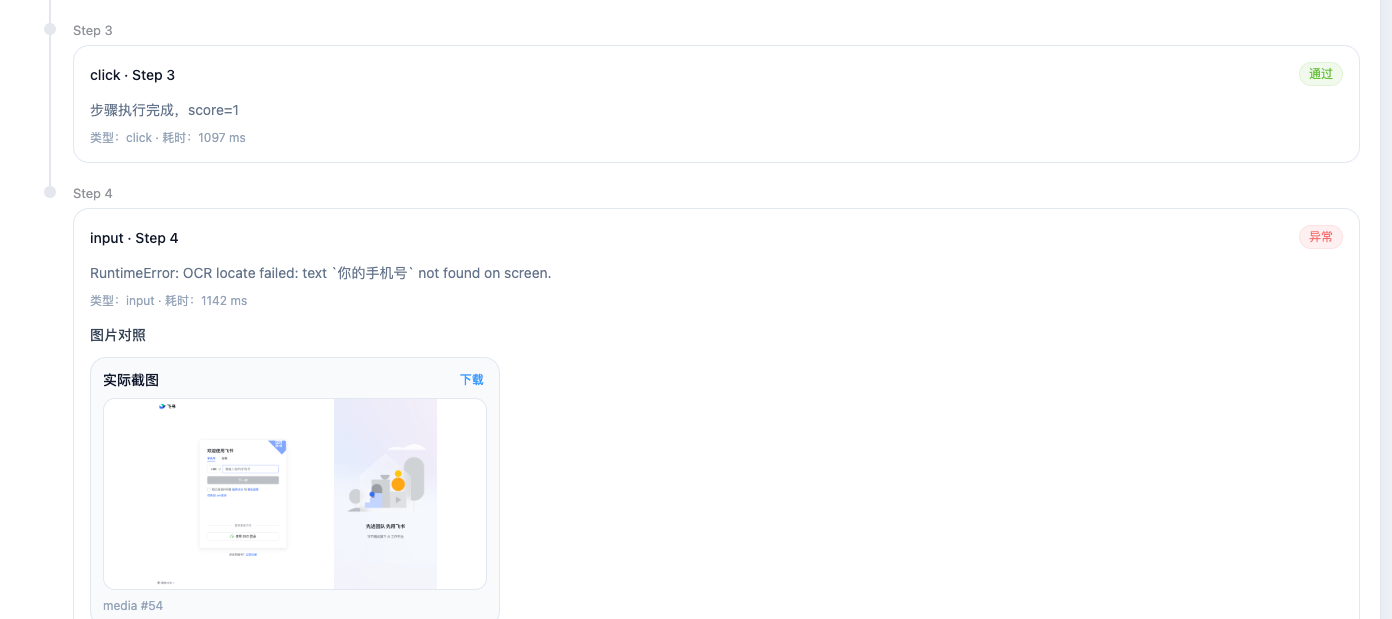 下图就是当时失败时的真实执行证据。虽然步骤已经走到了“等待进入验证码页”之后,但 OCR 断言仍然读到了登录页文本,而不是验证码